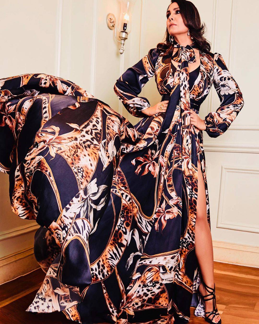 Lara likes to experiment on the subject of robes. She appears attractive on this Amit Aggarwal which she styled to perfection along with her comfortable, wavy tresses.