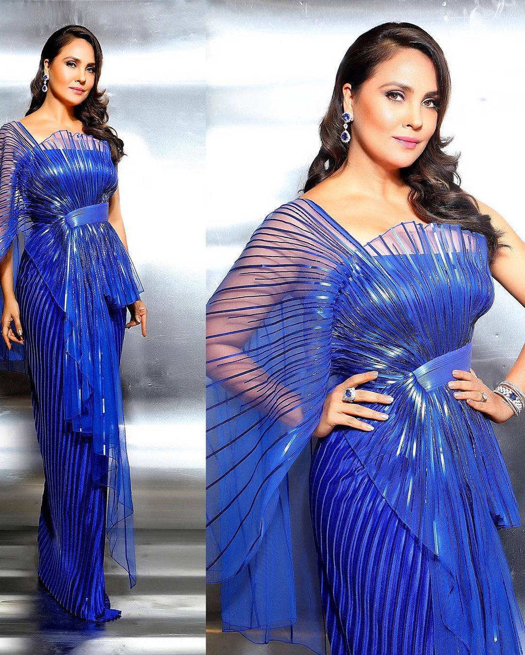Lara seemed ethereal on this white costume which she teamed with a pair of bejewelled heels. She tied her hair in a prime knot bun and completed off her look with a pair of hoop earrings.
